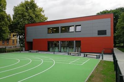 Der CUBE ist eine modulare Kleinfeldhalle mit einer Hallenfläche von 15 x 20 m und einer angeschlossenen Schulmensa.